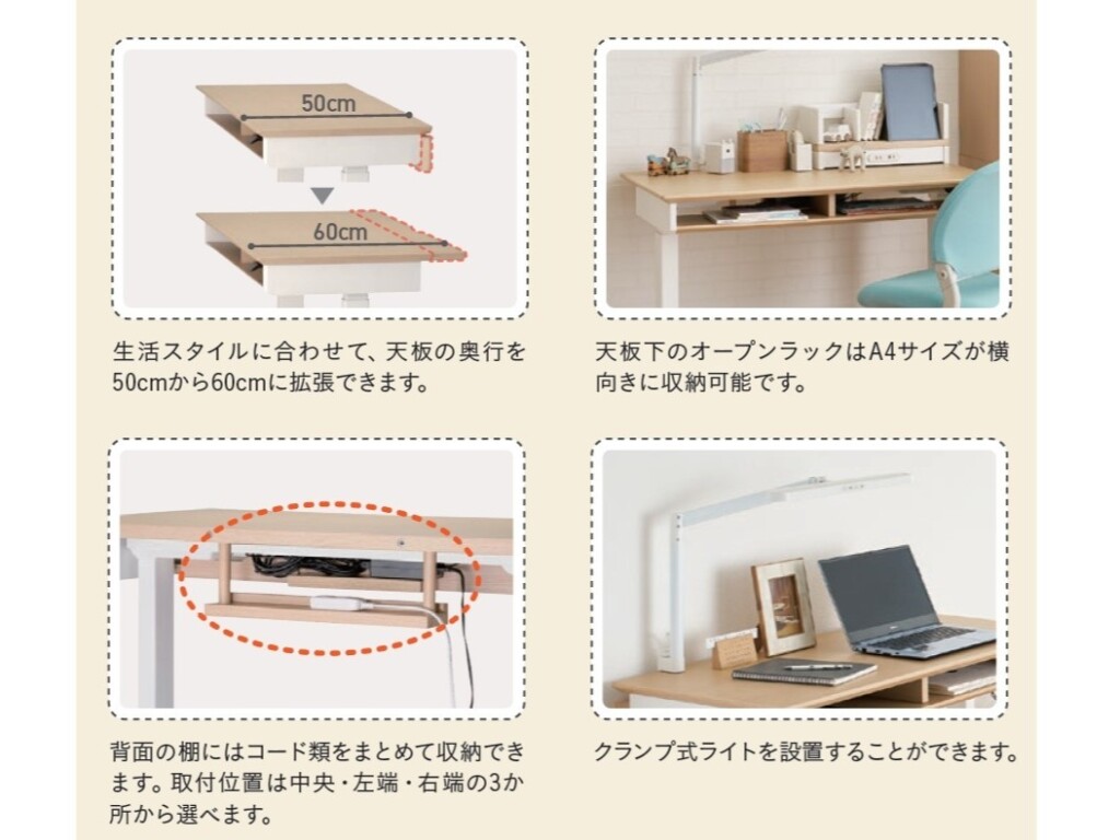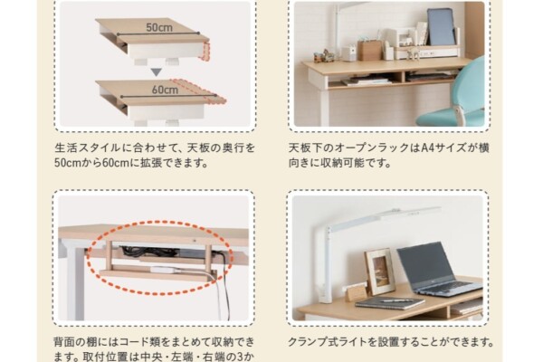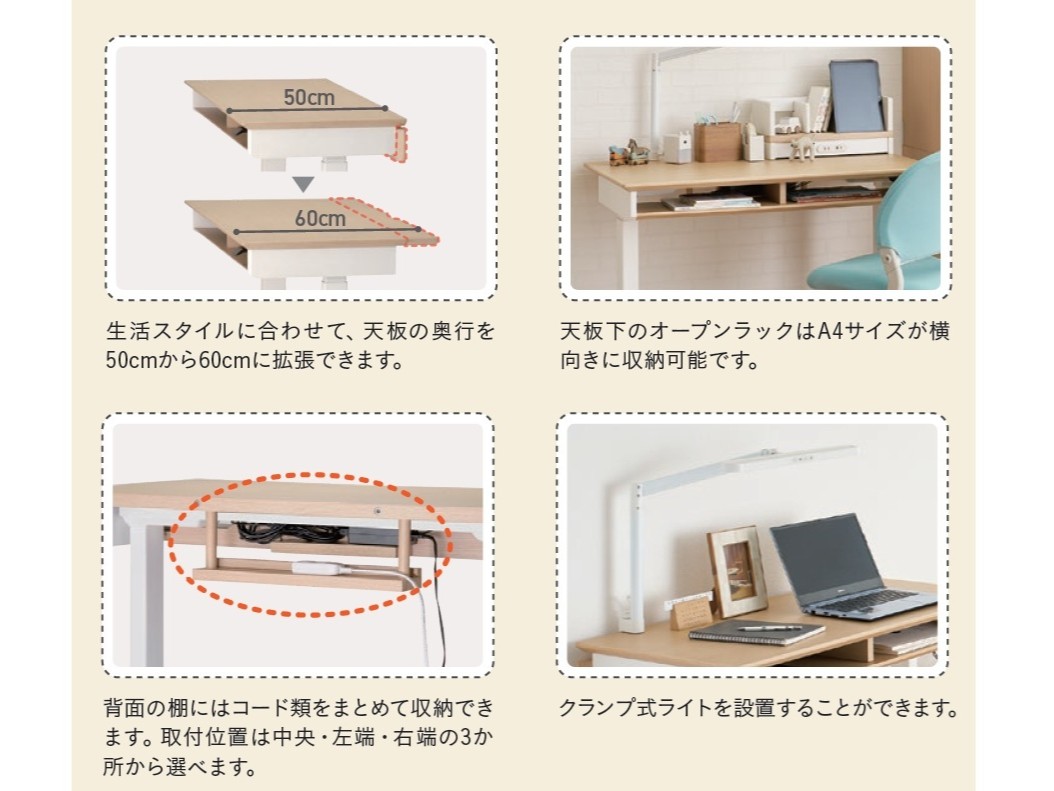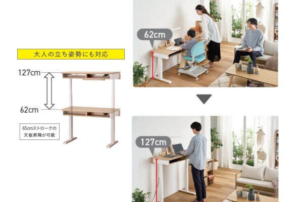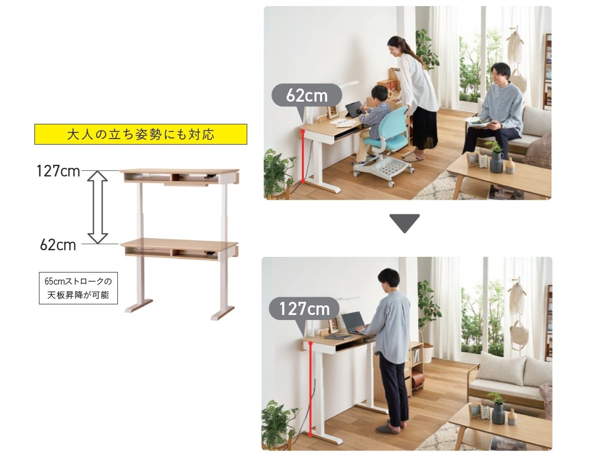 Famio サイズ W100×D54/60×H62~127 ㎝ 素材 プリント化粧繊維板/スチール ブランド Famio(ファミオ) お問い合わせはこちら シンプルデザインの電動昇降デスク 天板高は62~127cmまで調整可能で、お子様の座り姿勢から大人の立ち姿勢にも対応。高さを簡単に調整できるため、リビングに置けば家族全員で共有できます。 関連商品 FT BEENO JG6 No.2000