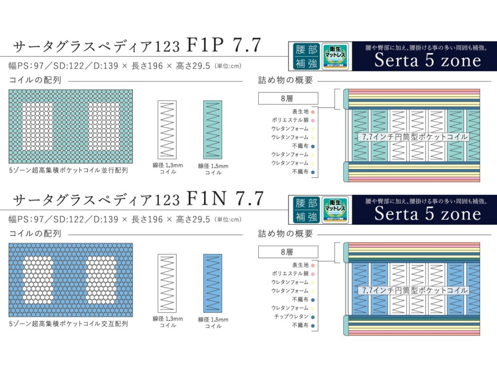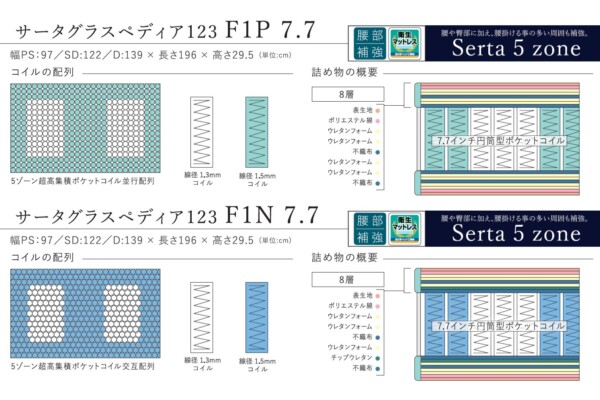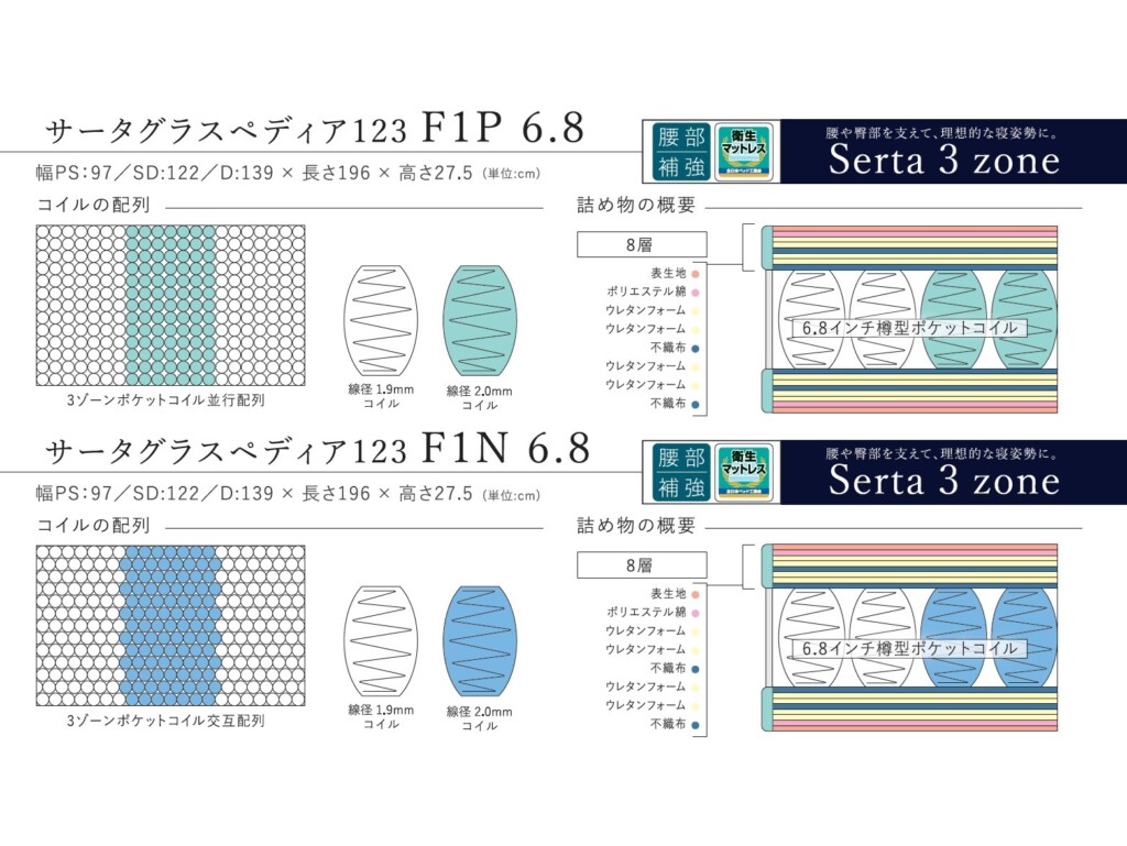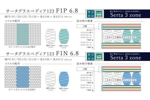 コイルの長さ、線径をSerta特有のゾーニング技術で区分けし、4タイプの寝心地がお選びいただけます。